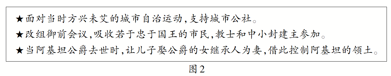 一轮复习小练习31中世纪晚期发表时间:2025-12-12 17:35 一轮复习小练习31 中世纪晚期的欧洲 1.11世纪,神圣罗马帝国皇室对铸币的控制较弱,许多铸币厂由教会掌控,其发行的货币占主导地位。法国铸币业被大领主控制,货币的原料、工艺和设计都颇为粗劣。英国王室则控制了大量铸币厂,每三到六年便调整货币设计。这表明当时西欧诸国 A.教会引领货币经济改革 B.封建经济陆续走向瓦解 C.王室鼓励铸币工艺创新 D.王权集中程度存在差异 2.下图所列为12世纪前期法兰西卡佩王朝路易六世在位期间的若干举措。这些举措旨在