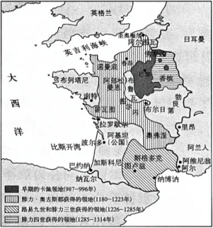 3.右图为11~14世纪法兰西卡佩王朝时期的王室领地图。图中领地变化体现出法兰西 A.民族国家形成 B.封建社会衰落 C.诸侯势力扩大 D.王权不断加强 4.12世纪下半叶英国建立正常的巡回审判制度后,“巡回法庭把越来越多的重要案件从郡长手中抽走,纳入自己手中。……他们侵入到贵族领地内,甚至侵入到独立于郡法庭或百户区法庭之外的特许领地和庄园,审查它们的决定,干预它们的判决”。这些做法意在 A.确立法律至上原则B.扩大王室领地C.瓦解封建庄园制度D.强化国王权力 5.英国议会最初由封建教俗贵族组成,旨在协助国王解决财政困难。1265年骑士和城市市民代表首次参加议会,并于1341年起单独议事,最终组成议会下院。通过议会,国王在一定程度上获得了金钱和人力的支持,而议会亦可向国王提出请愿。关于中世纪英国议会,下列说法正确的是 A.国王可不经议会同意而加征新税 B.下院形成标志着君主立宪制建立 C.城市市民是国王联合的重要对象 D.贵族通过议会掌握了国家行政权 6.13世纪初,贵族集团发起了反对英王约翰的武装起义,并迫使英王签署《大宪章》。其中规定除传统封建捐税外,任何赋税必须经“全国公意许可",为取得全国公意许可,需召开大会议。这表明英国 A.国王权力受法律约束 B.君主立宪政体逐步确立 C.议会成为权力的中心 D.社会契约思想开始流行 7.14世纪初,法国国王为与教皇对抗,召开了由高级教士、世俗贵族和富裕市民代表组成的三级会议。此后,三级会议逐渐成为法国政治生活中的一部分。但该会议往往是在国王需要征收新税或需要各等级代表支持处理一些重大问题时才召开。这说明当时三级会议 A.代表了资产阶级利益B.推动了宗教改革开展C.有利于王权统治加强D.强化了封君封臣制度 8.中古时期,西欧司法审判中盛行“决斗裁判”和“神意裁判”。11世纪初,随着西欧城市的兴起,城市中的商人开始选出仲裁人,并依据“萌芽性的商法”进行审判,逐渐形成了市民法庭。这反映出 A.城市崛起促进王权加强 B.自由主义打破封建束缚 C.新兴阶层冲击教会特权 D.商业发展推动司法进步 9.13世纪,北欧的《日德兰法书》写道:“国家应根据法律建立”;欧陆腹地的《萨克森明镜》规定:“如果一个人的过往和法官做了不当行为,那么他必须加以抵制”;西南欧的阿拉贡法律规定只要国王履行其职责,臣民就要服从他,“否则的话就不然”。这些事例说明 A.法律至上观念兴起B.市民阶层力量强大C.民主政治初步建立D.封建王权逐步强化 10.1469年,西班牙卡斯蒂利亚王国的伊莎贝拉一世与阿拉贡王国的斐迪南二世成婚,两者构成良好的政治伙伴关系。他们从教皇那里得到任命西班牙主教的权力,如主教西斯内罗斯成为卡斯蒂利亚王国的首要大臣,贯彻净化教会、遏制贵族统治以及博取城市支持等政策。这些事件 A.奠定了民族国家的基础B.结束分裂的政治局面C.将教会置于世俗权力下D.逐步地扩大王室领地 11.中世纪中前期,地中海地区的主流通货是拜占庭帝国的苏勒德斯金币、阿拉伯帝国的第纳尔金币。自13世纪中叶起,佛罗伦萨的弗洛林金币和威尼斯的杜卡托金币取代它们,成为地中海贸易的主流通货。这一转变的原因是 A.意大利民族国家兴起B.封建庄园制度的成熟C.大量贵金属涌入欧洲D.城市商品经济的发展 12.中世纪后期,西欧城市复苏的标志之一是“修建城墙”。一“墙”之隔区分了墙内外居民的法律身份:墙内居民因特许权解除了在采邑制和庄园制之下形成的人身依附关系,并可自由选择其经济活动的内容和方式。这一历史现象 A.表明了封君封臣之间的关系 B.概括了西欧封建庄园的特征 C.呈现了王权逐步加强的趋势 D.说明了城市自治产生的前提 13.中世纪英国某市商人行会规章规定:除基尔特会员之外,任何人皆不得购买蜂蜜、油脂、腌青鱼、磨石、生革、生皮,或任何种类之油,亦不得开设酒馆;违反此项禁令者,一经查明属实,应即没收其货物归于国王。这反映该市 A.工商业经营范围大受限制 B.工商业者遭受国王的盘剥 C.工商业自治得到王权支持 D.工商业发展导致行业垄断 14.13世纪以前,西欧的行会具有明显的开放性,学徒、帮工不论家庭出身,只要合乎资格就可以成为行会成员;13世纪以后,掌握着资本和生产的富人阶层控制了行会,出身贫寒的学徒、帮工面临着更高的入会门槛,行会成员逐渐成为世袭身份。这反映出 A.技术革新速度加快B.市场竞争日益加剧C.城市管理体制逐步完善D.王权对城市的控制加强 15.在中世纪西欧抄本发展的过程中,出现了在页边处绘制装饰图画的传统。13世纪末,一些抄本页边绘有“骑士在蜗牛面前落荒而逃”的场景,有学者指出这些“蜗牛”代表新兴银行家群体。这反映出当时 A.骑士阶层弃武从商 B.绘画艺术风格迎来变革 C.商人控制抄本创作 D.封建等级秩序面临挑战 16.在基督教神学思想统治下的欧洲,封建王朝迫切需要一种新的精神力量。1414年,英王颁布法令,要求在诉讼中需陈述被告的财产和地位(这一目的主要是为了保护贵族特权),为了在法令中表示骑士、男爵家族中年轻的、还没有贵族头衔的成员,“绅士”一词得以诞生。“绅士”的出现 A.适应了新兴资产阶级的需要 B.体现了封建王权的发展 C.反映了宗教改革的思想主张 D.摆脱了基督教神学束缚 17.11世纪以后,西欧各地纷纷建立大学。1500年
